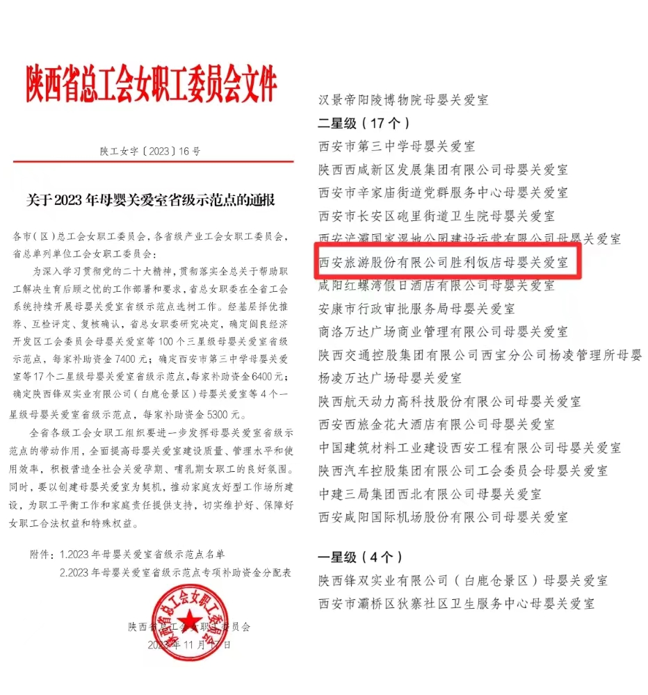 為深入學習黨的二十大精神,貫徹落實全總關于幫助職工解決生育后顧之憂的工作部署和要求,省總女職委在全省工會系統(tǒng)持續(xù)開展母嬰關愛室省級示范點選樹工作。經基層擇優(yōu)推薦、互檢評定、復核確認,西旅股份旗下勝利飯店母嬰關愛室被評定為2023年“二星級母嬰關愛室省級示范點”。
