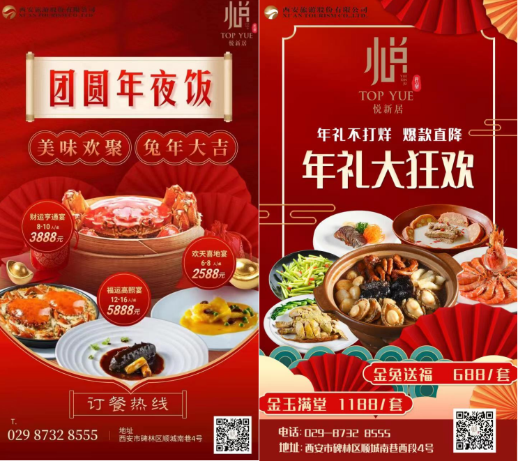 旗下鉑金萬澳·勝利飯店還迎新推出“年年有余”“瑞兔呈祥”“良辰美景”“闔家歡樂”四款精品年夜飯;悅新居民宿充分利用自身餐飲屬性,推出賦有淮揚特色的“歡天喜地”“財運亨通”“福運高照”三款年夜飯及“金兔送福商務禮盒”和“金玉滿堂福氣禮盒”兩款高端年貨禮盒,多元化營銷方式為市民提供迎新選擇。