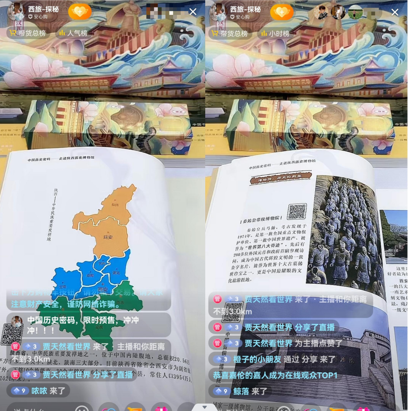 西旅直播在假日期間有針對性對《中國歷史密碼》數(shù)字文創(chuàng)讀物套裝進行3場直播活動,通過直播有效宣傳產品,輸出展示三秦大地厚重而悠遠的歷史文化。